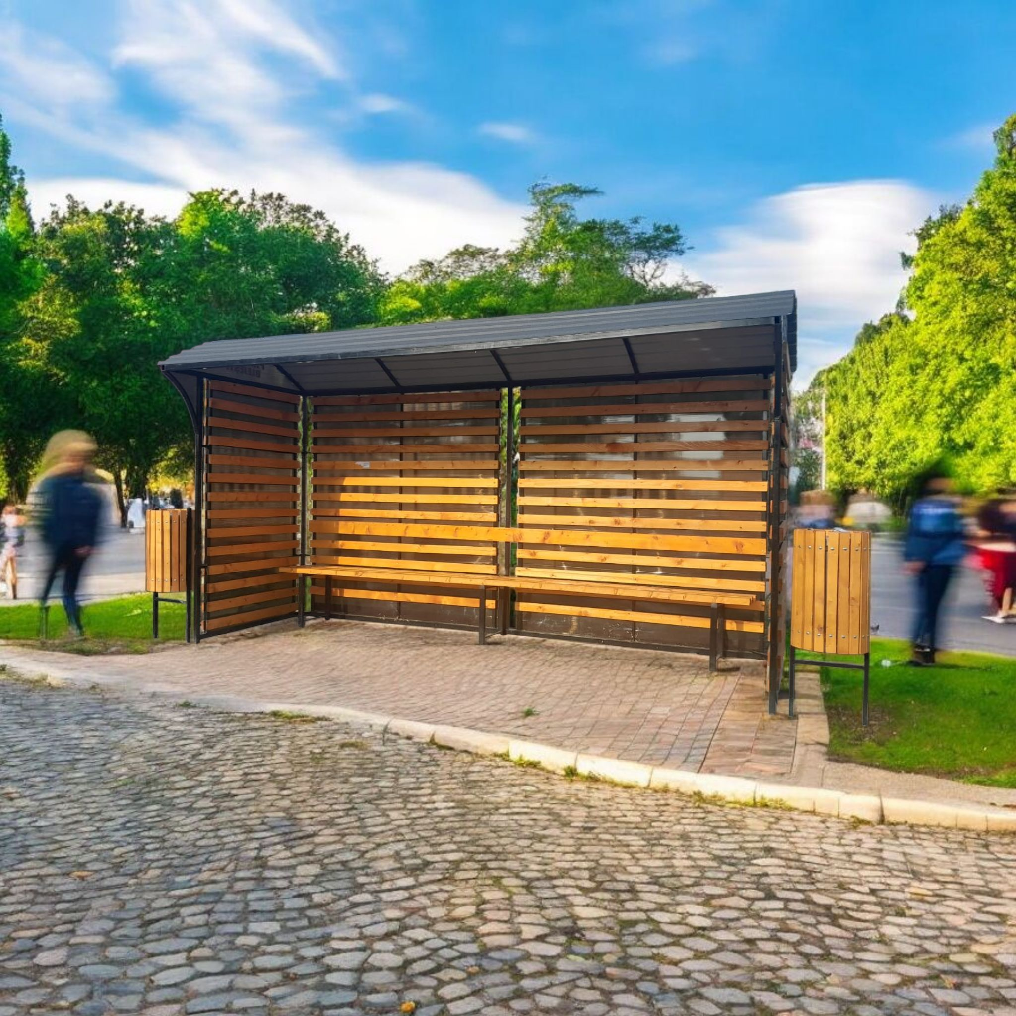 Statia de autobus este invelita in policarbonat peste policarbonat se pune ulucutele din lemn pentru a asigura mai multa rezistenta